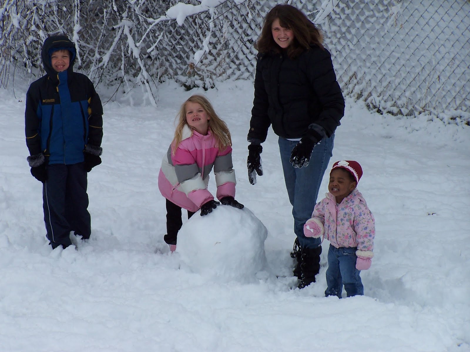 We woke up this April morning to 10.5 inches of snow! Unbelievable. And it's Spring break here for the school kids. So, what else could I do but send the kids outside to build a snowman. Especially since Carly had never really played in the snow or built a snowman. Not a popular decision with Julie since she hates snow. Although, I think she did like showing Carly the ropes! Plus, the cousins were over and they had fun, too. Still, SNOW in APRIL! Not Cool! Downright COLD!